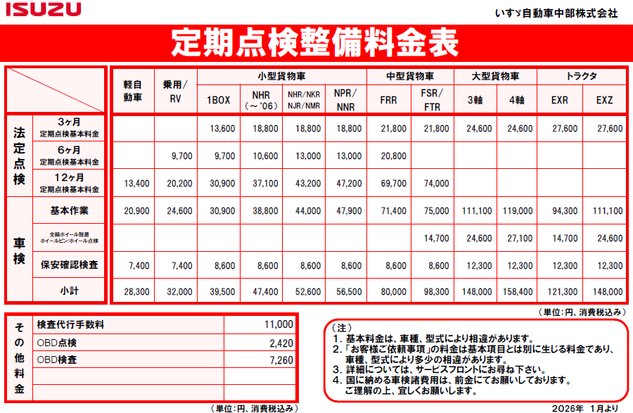 定期点検整備料金変更のお知らせ(2026年1月より)
