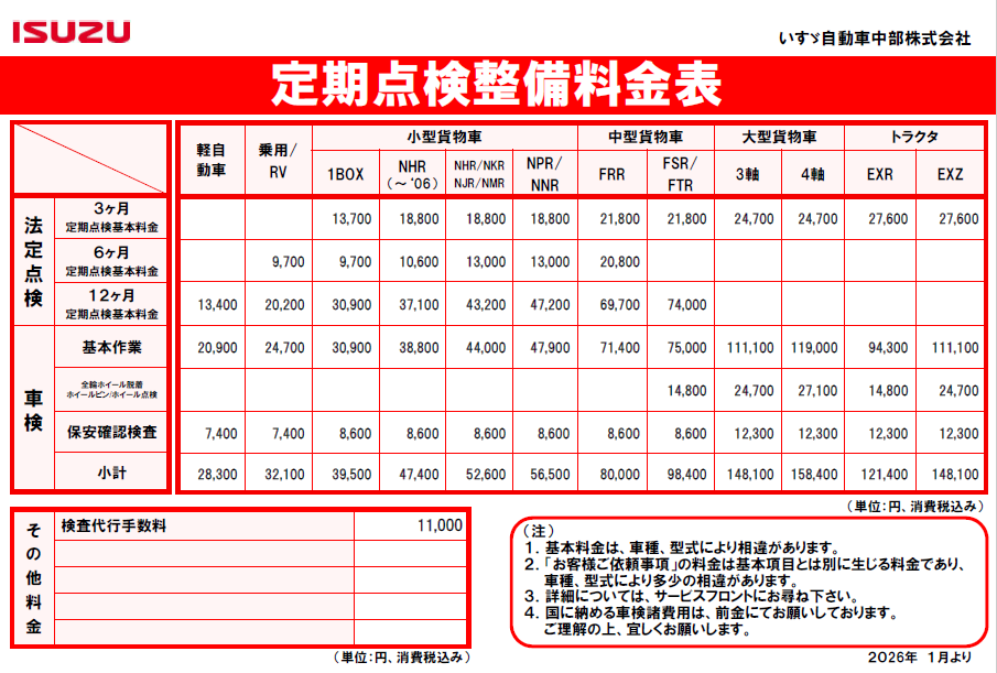 定期点検整備料金変更のお知らせ(2026年1月より)